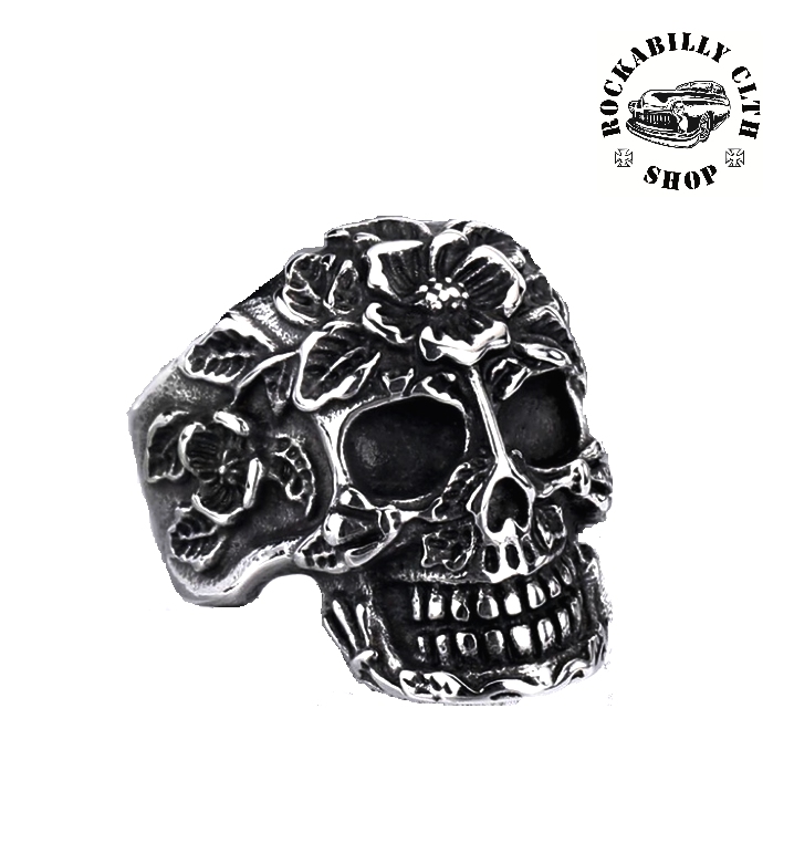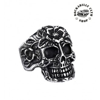 Stříbrný prsten s horrorovým motivem je parádním doplňkem pro každou příležitost. Motiv lebka, horror, růže. Dodává Rockabilly clothing shop www.rocka.cz