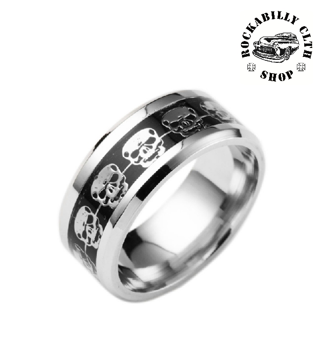 Stříbrný prsten s horrorovým motivem je parádním doplňkem pro každou příležitost. Motiv lebka, horror, lebky. Dodává Rockabilly clothing shop www.rocka.cz