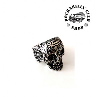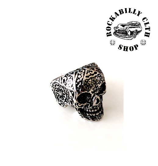 Stříbrný prsten s horrorovým motivem je parádním doplňkem pro každou příležitost. Motiv lebka, lebky, retro, vintage. Dodává Rockabilly clothing shop www.rocka.cz