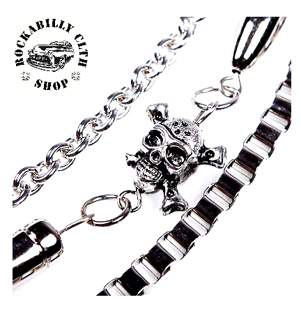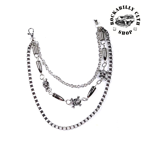 Ozdobný řetěz k peněžence, řetěz je na obou stranách opatřen kovovými karabinami pro uchycení klíčů nebo peněženky. Motiv řetěz, peněženka, nábojnice, lebky, barva stříbrná. Dodává Rockabilly Clothing Shop Praha.