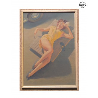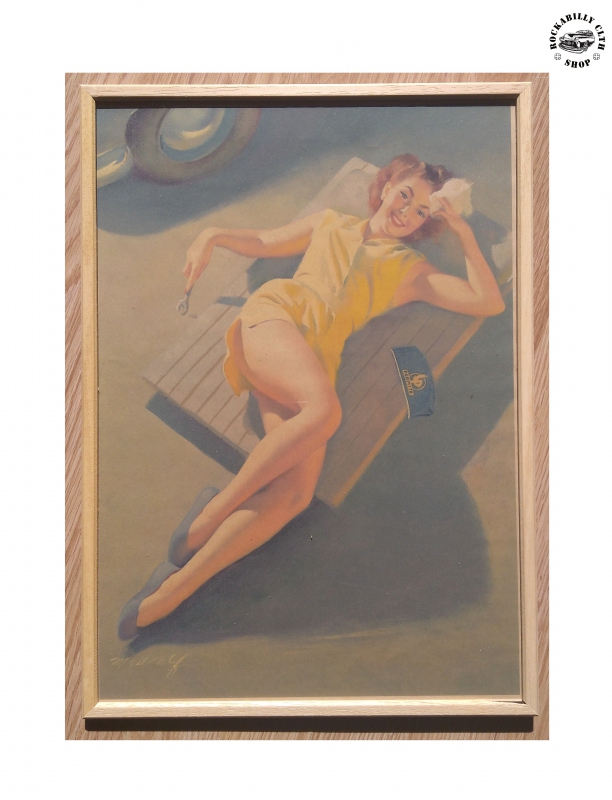 Retro obraz pin-up girl na zeď, zasklený, v dřevěném rámu, parádní doplněk do bytečku nebo kanceláře, motiv pin-up, retro americké auto, autoservis, velikost A5 (30 x 42 cm)
