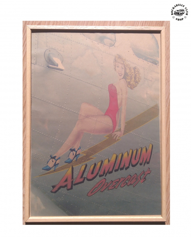 Retro obraz pin-up girl na zeď, zasklený, v dřevěném rámu, parádní doplněk do bytečku nebo kanceláře, motiv pin-up, retro americké letadlo, velikost A5 (30 x 42 cm)