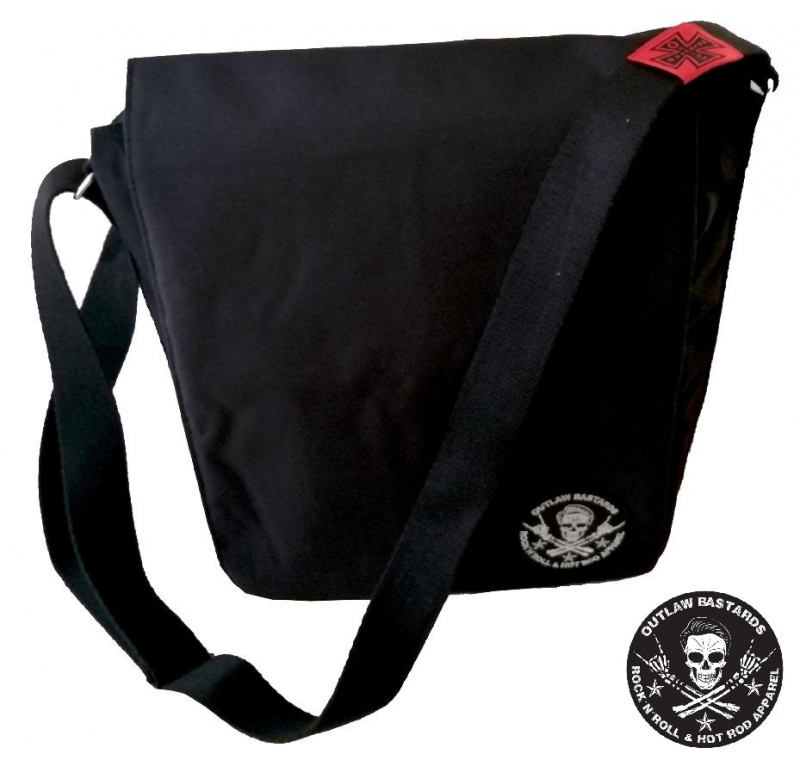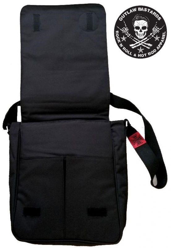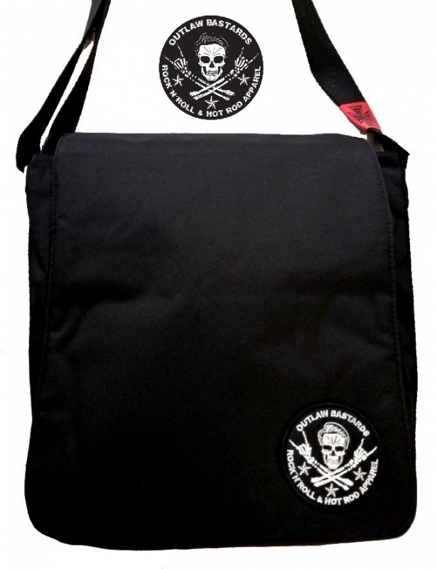 Taška přes rameno značky Outlaw Bastards velká, vel. 28 x 32 x 11 cm. , vpředu 2 kapsy, uvnitř další kapsa na zip, vzadu velká kapsa , barva černá, dodává Rockabilly Clothing Shop Praha www.rocka.cz