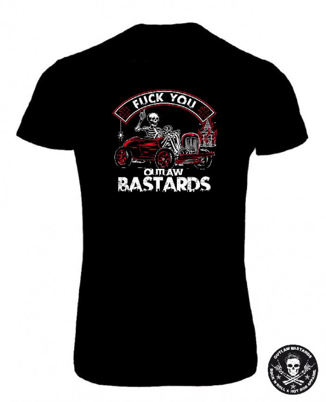 100% bavlněné černé dámské tričko značky Outlaw Bastards, dodává Rockabilly Clth. Shop Praha www.rocka.cz , motiv old school, punk, rockabilly, rock´n´roll, hot rod