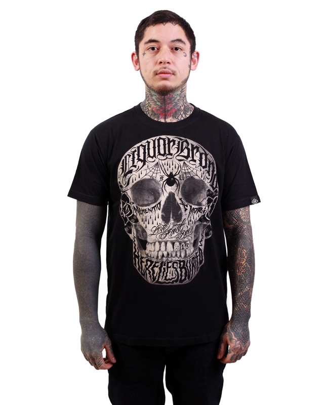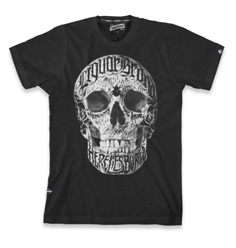 100% bavlněné exkluziv pánské černé rockabilly - rock´n ´roll - tattoo tričko Liquor Brand, vpředu s kvalitním potiskem, motiv muerta, love, lebka, old school tattoo, dodá Rockabilly Clothing Shop Praha