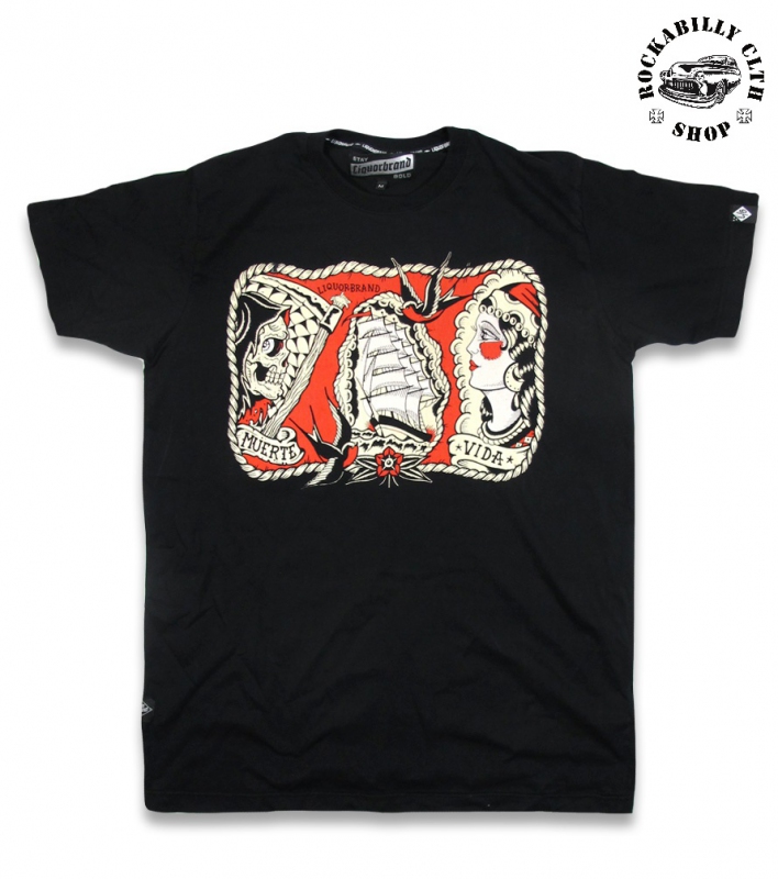 100% bavlněné exkluziv rockabilly - rock´n ´roll - tattoo tričko Liquor Brand, vředu s kvalitním potiskem, motiv lebka, námořnický, muertka, dodá Rockabilly Clothing Shop Praha