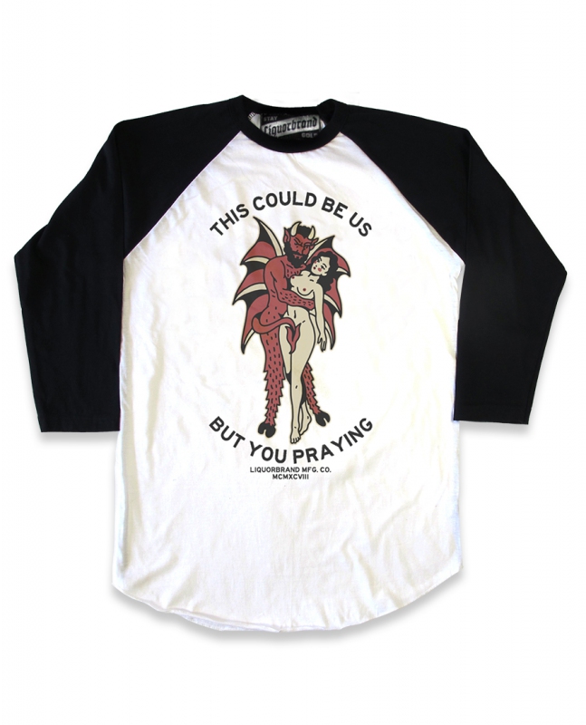 100% bavlněné exkluziv pánské rockabilly - rock´n ´roll - tattoo raglan dvoubarevné tričko Liquor Brand, vpředu s kvalitním potiskem, motiv ďábel, old school tattoo, dodá Rockabilly Clothing Shop Praha