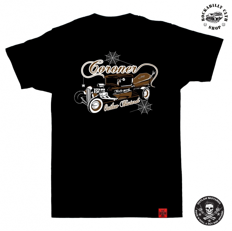 100% bavlněné černé pánské tričko značky Outlaw Bastards, motiv retro, rockabilly, rock´n´roll , hot rod, kustom, coroner motiv, dodává Rockabilly Clth. Shop www.rocka.cz